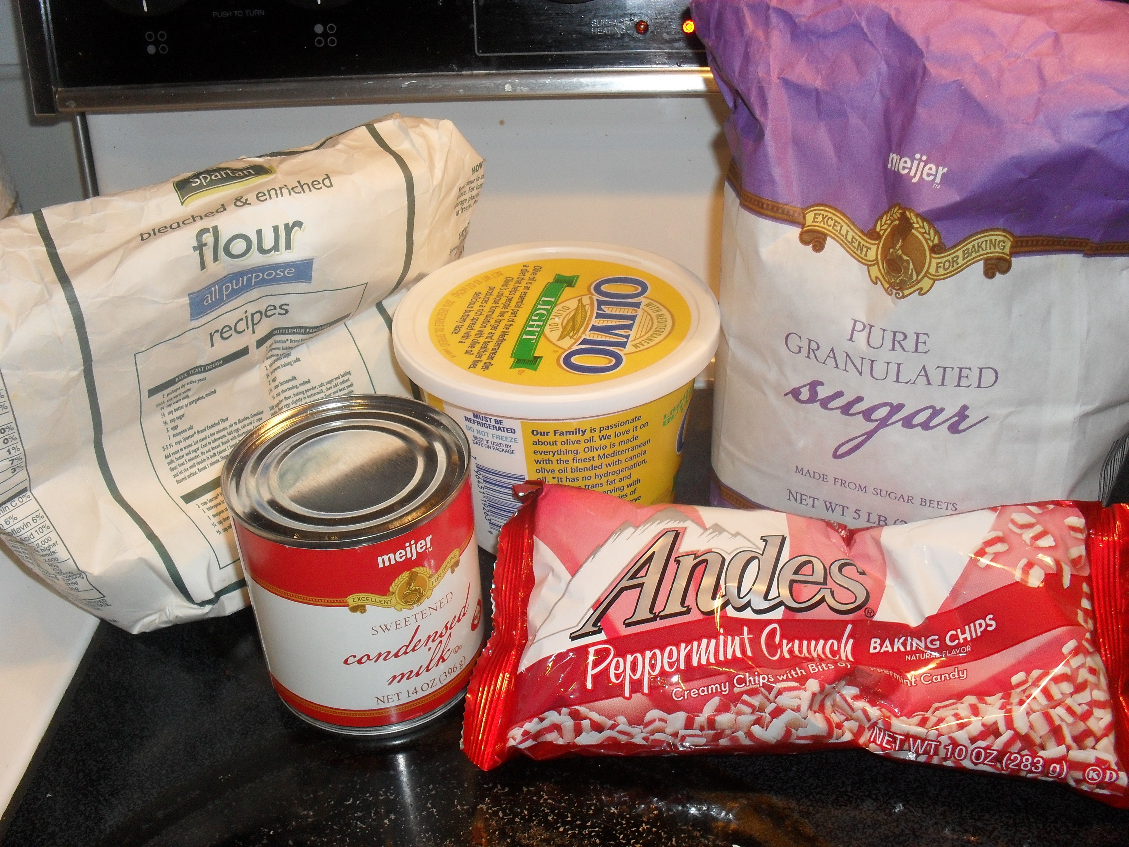 Condensed milk, peppermint, sugar, flour and butter are the ingredients