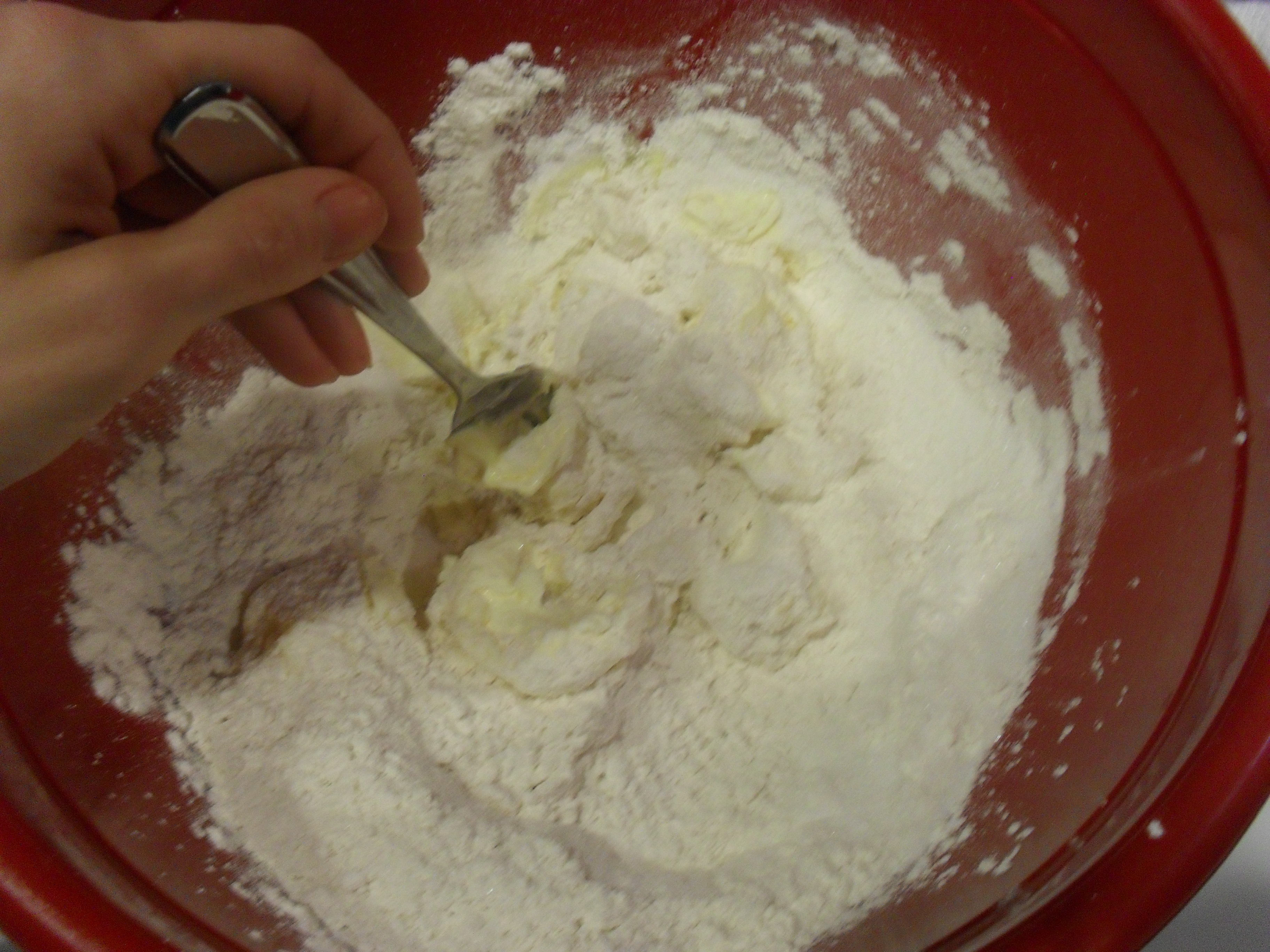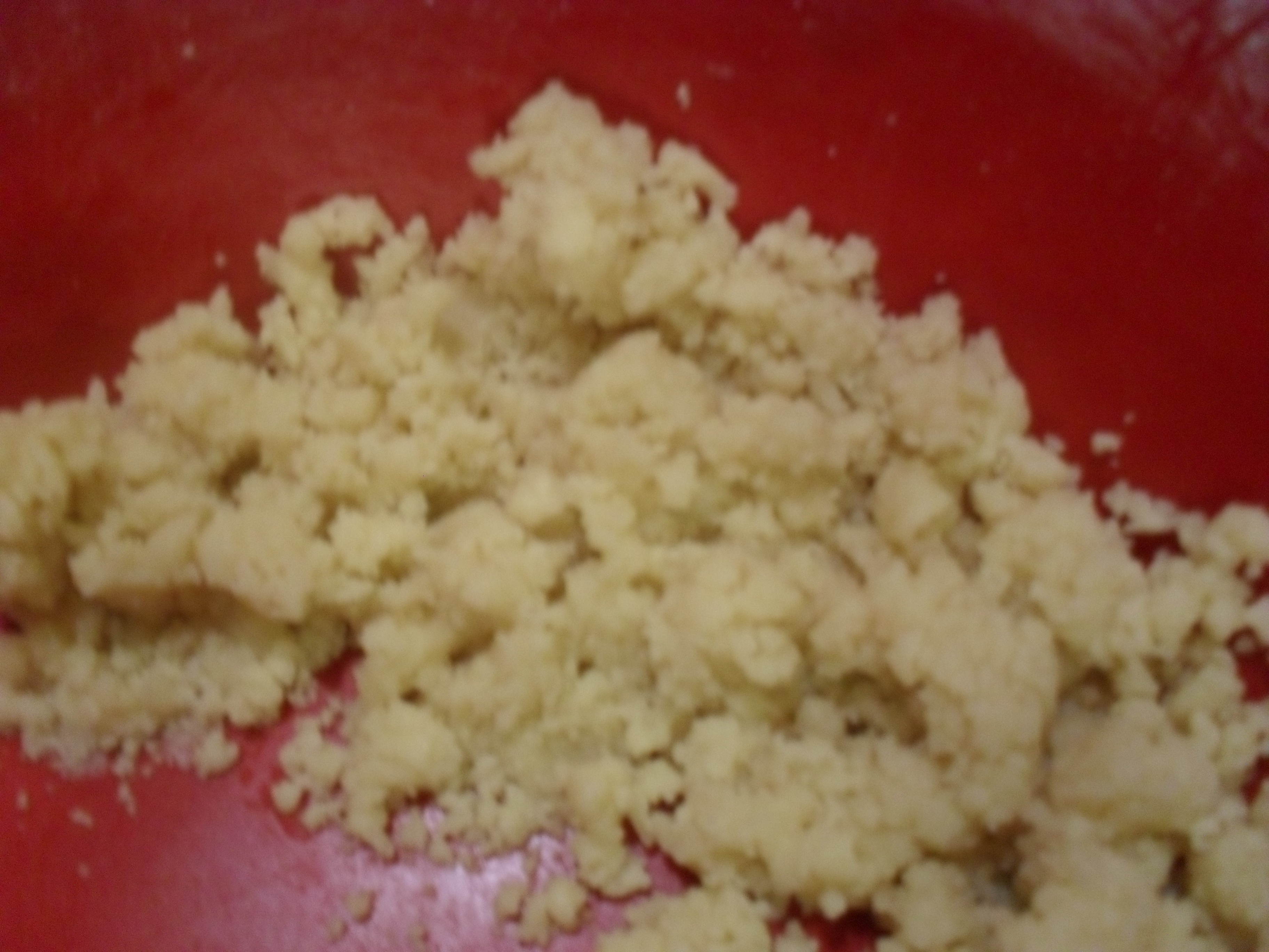 - Use a pastry cutter or a fork to cut the butter, sugar, and flour together until crumbly.