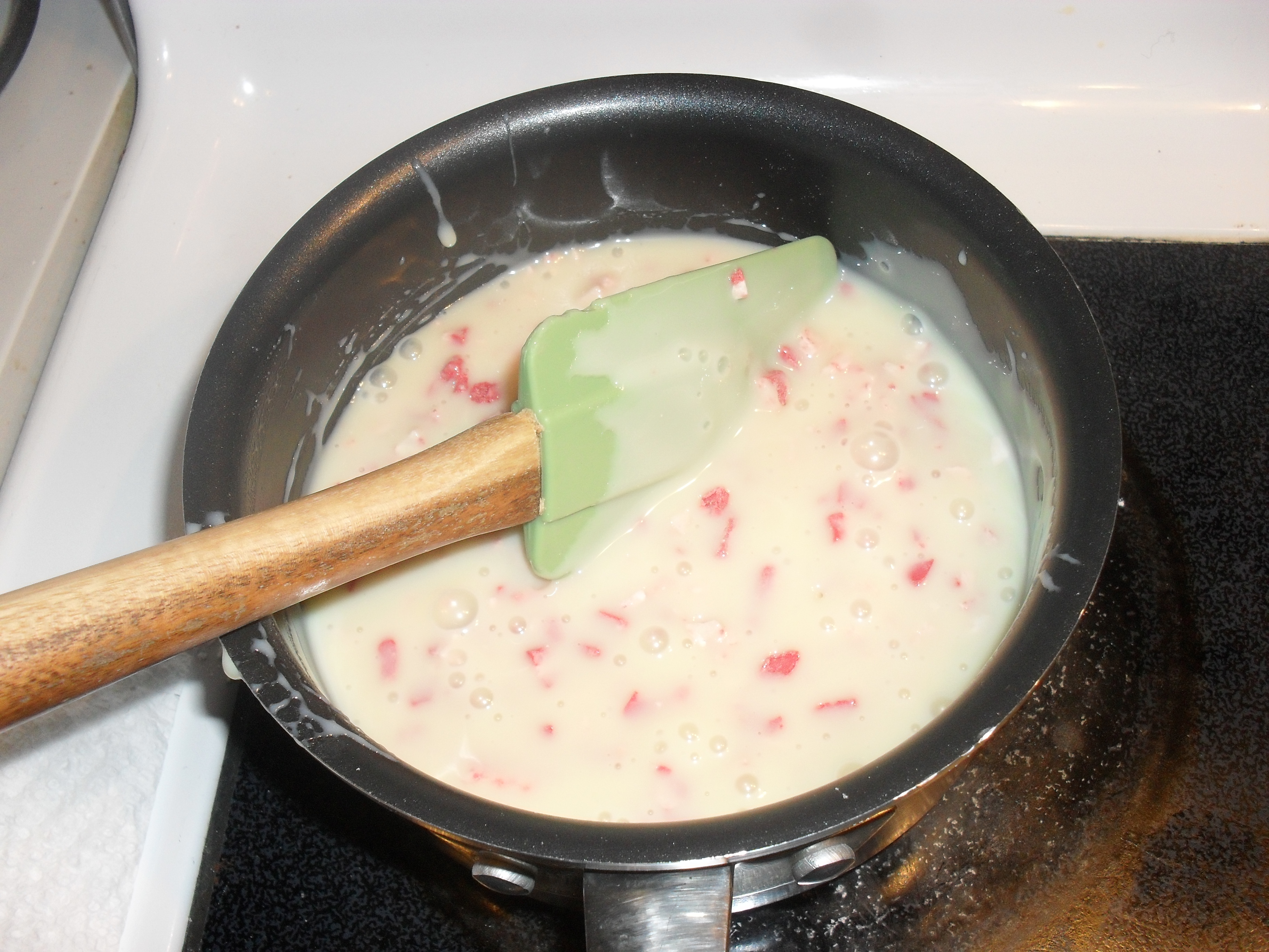 - In a medium saucepan over low heat, mix 1 cup of the white chocolate peppermint candy and the sweetened condensed milk until smooth.