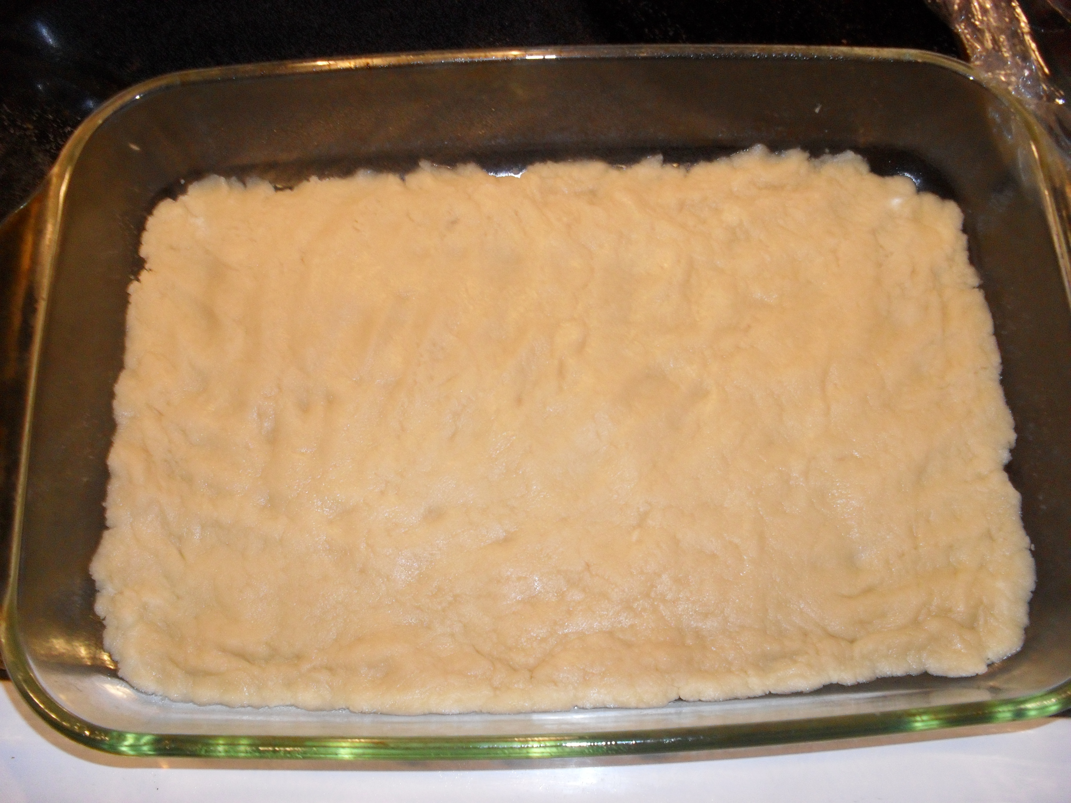 - Press a little more than half of the crumble mixture into the bottom of a 9×13 lined baking dish.