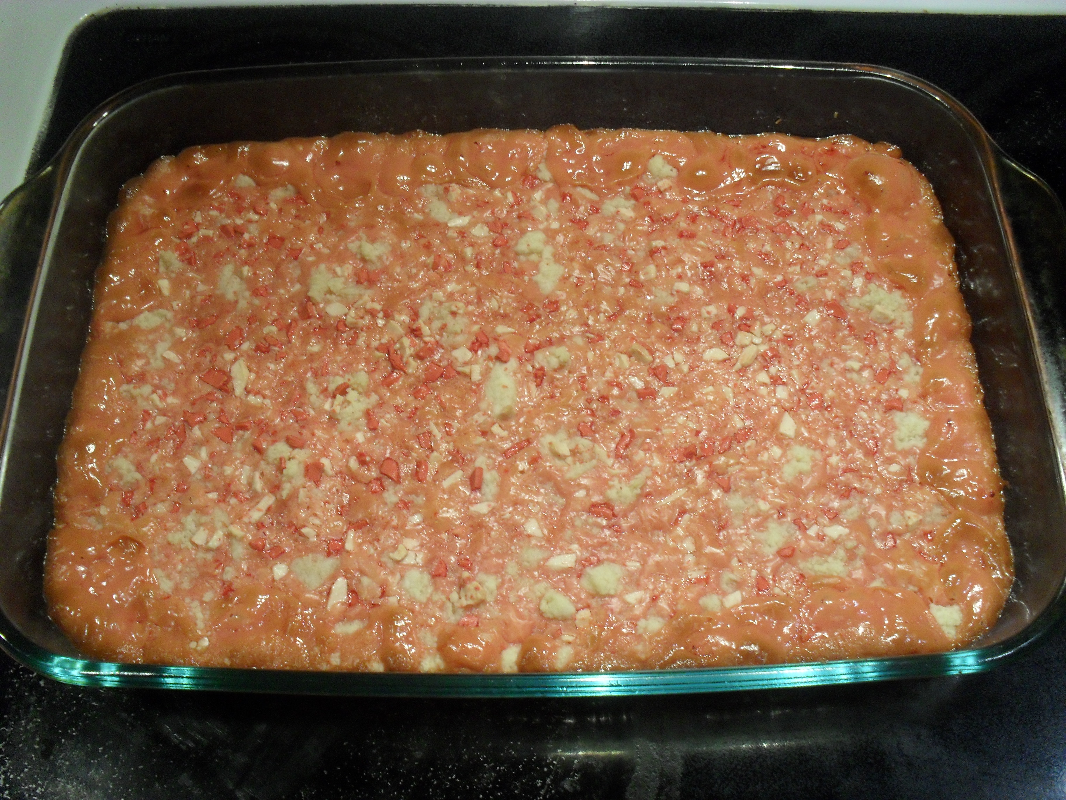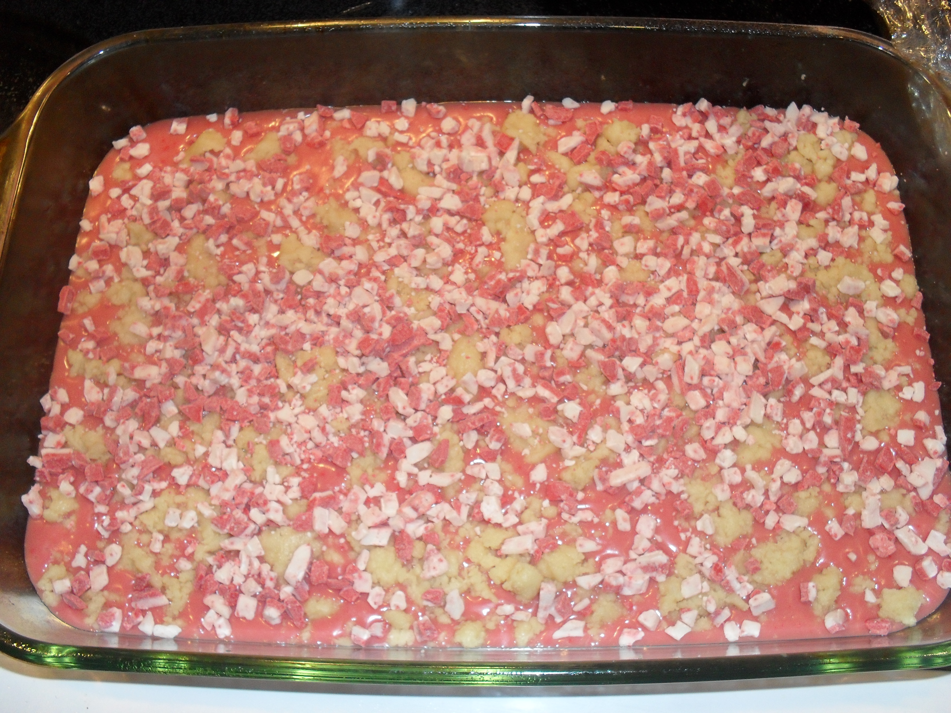 - Sprinkle the remaining crumble and white chocolate peppermint candy evenly over top.