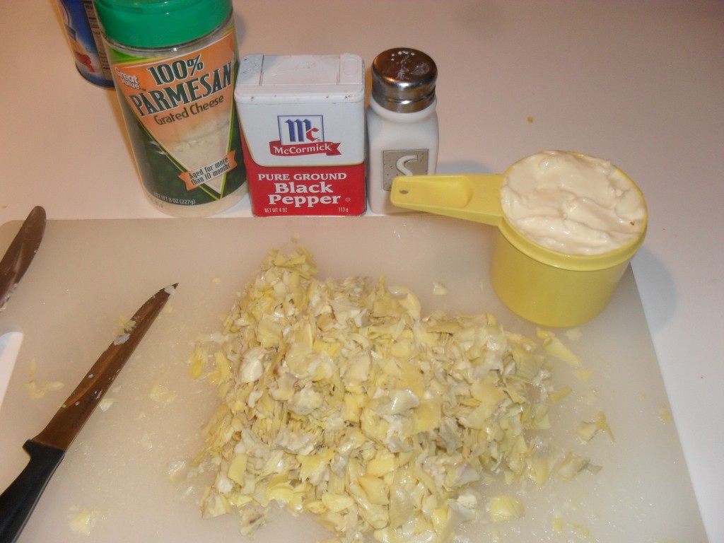 Easy ingredients: Parmesan cheese, mayonnaise, 2 cans of artichokes, salt and pepper to taste