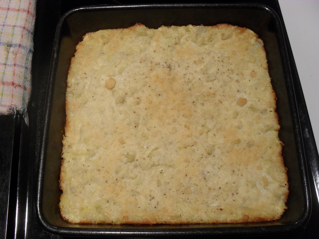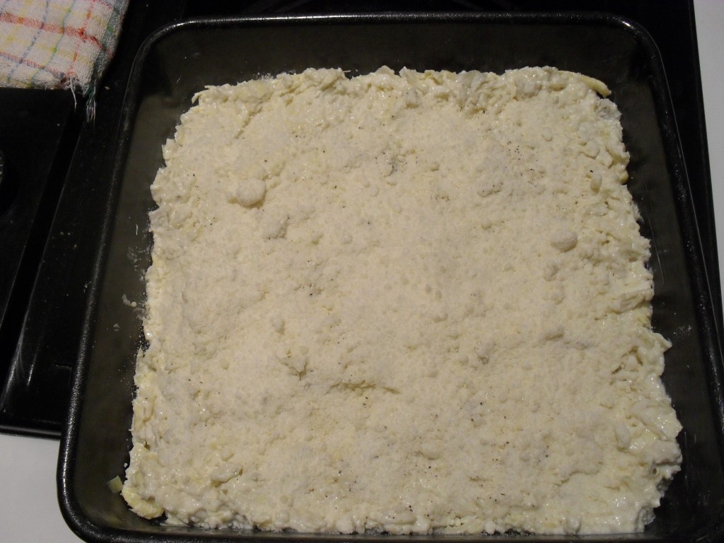 Spread into an 8 by 8 baking dish. Add salt and pepper to taste. Heat oven at 350 and bake for 30 minutes.