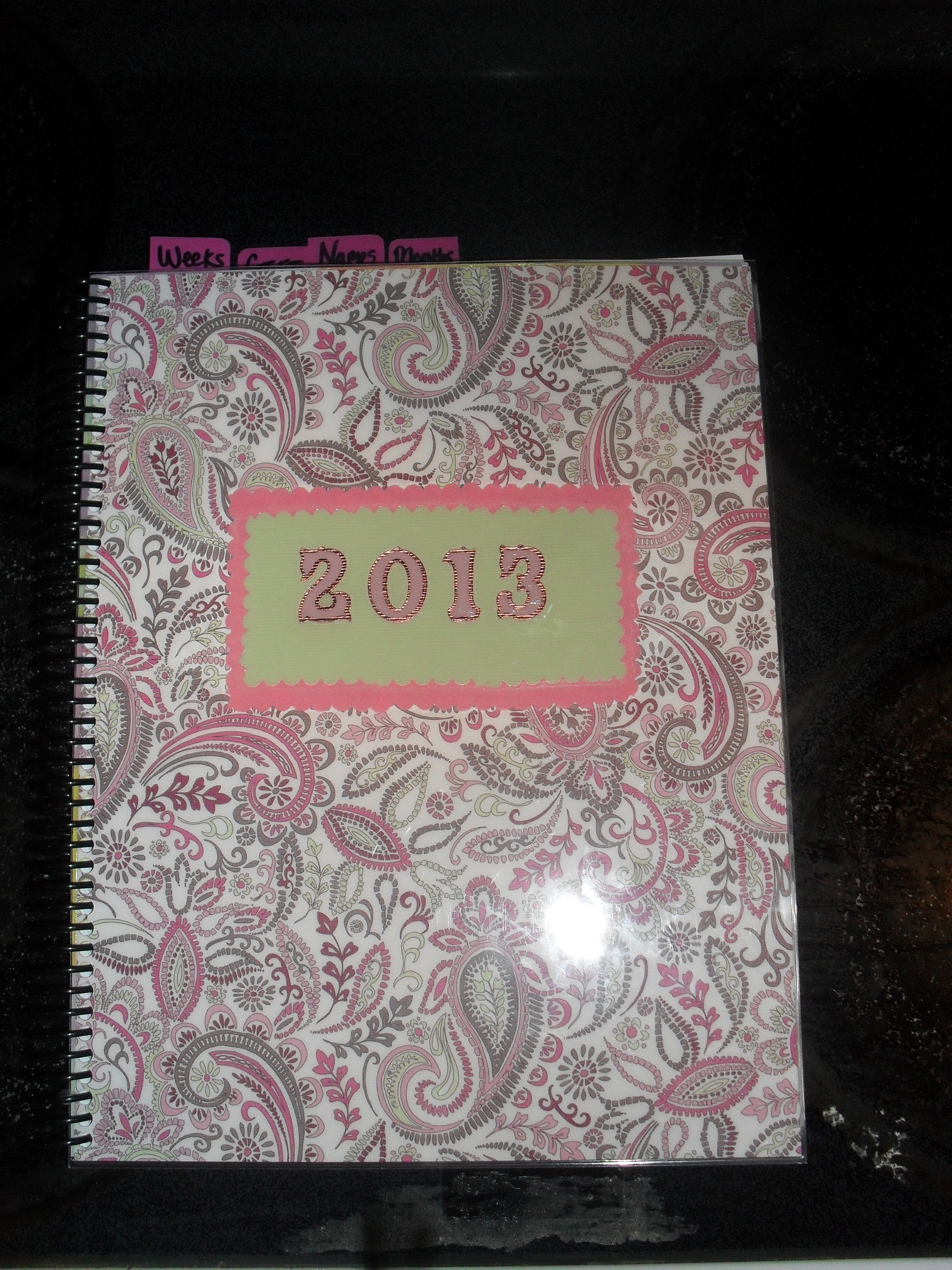 I made a trip to Michael’s, picked out 2 sheet of scrapbook paper for the front and back cover and chose some stickers for the year, 2013. My total cost for those items were only $3.00! Once I tweaked the pages on Microsoft Word, I printed out one copy of each different page and organized them in order, to my liking.