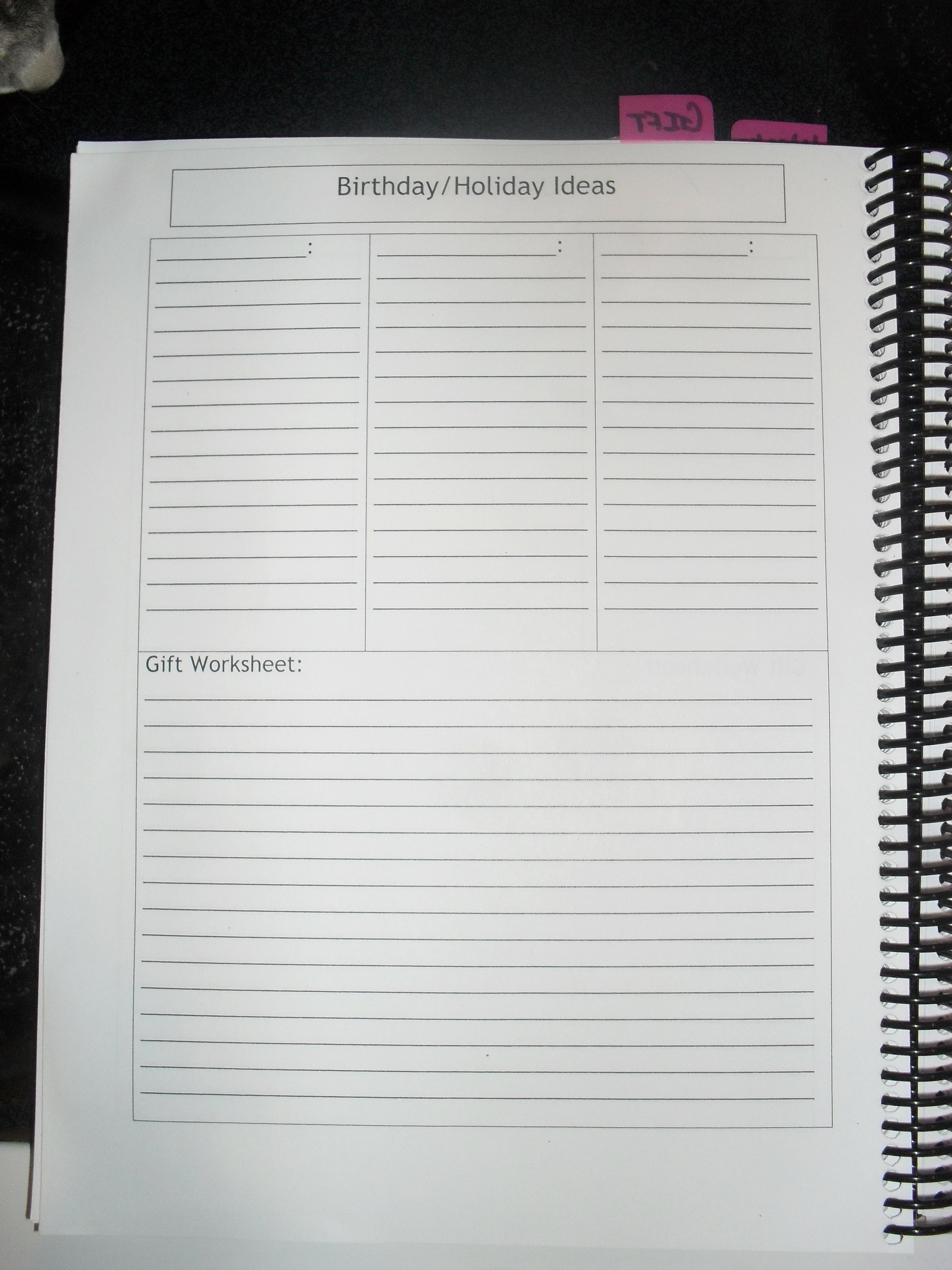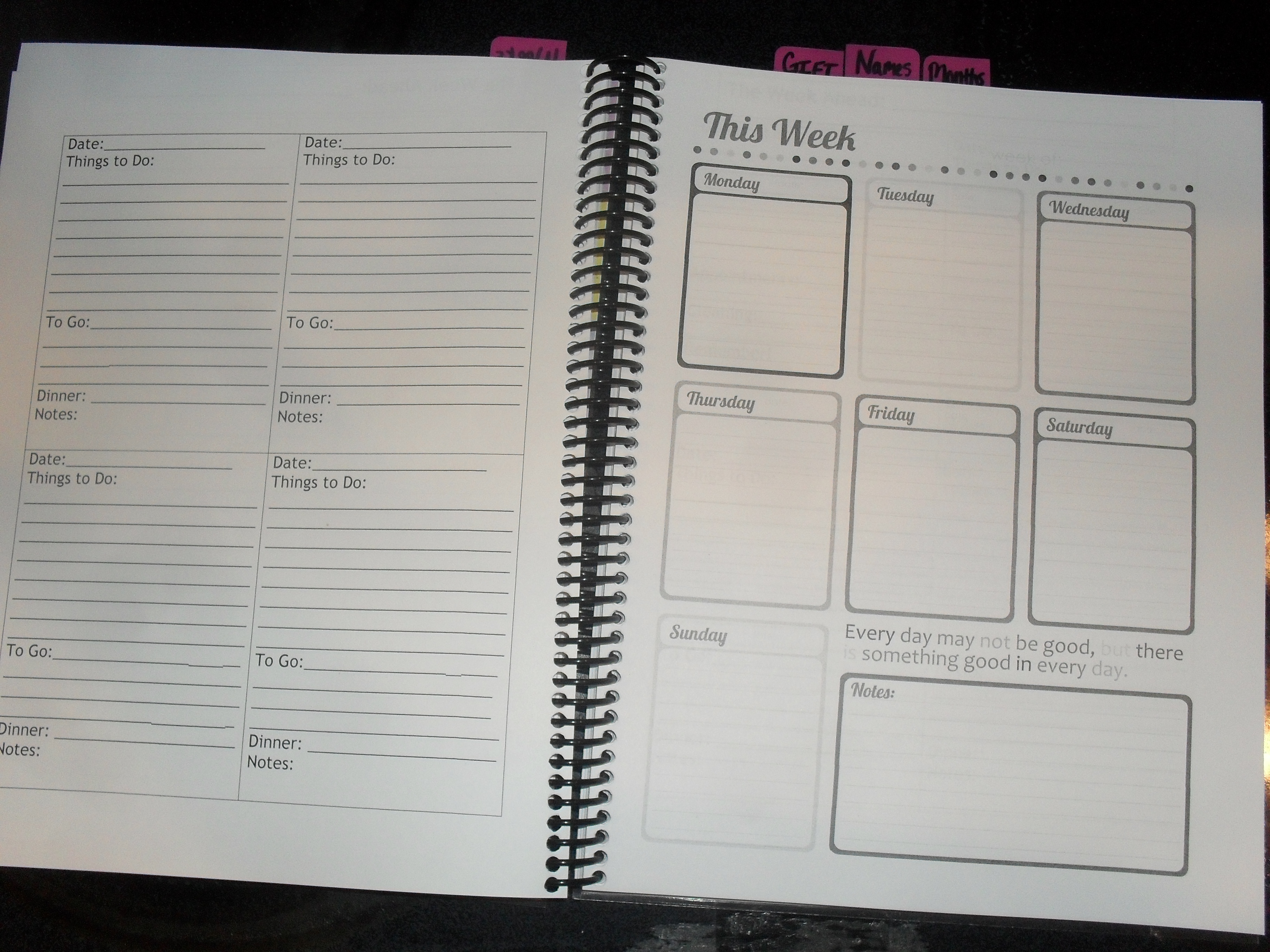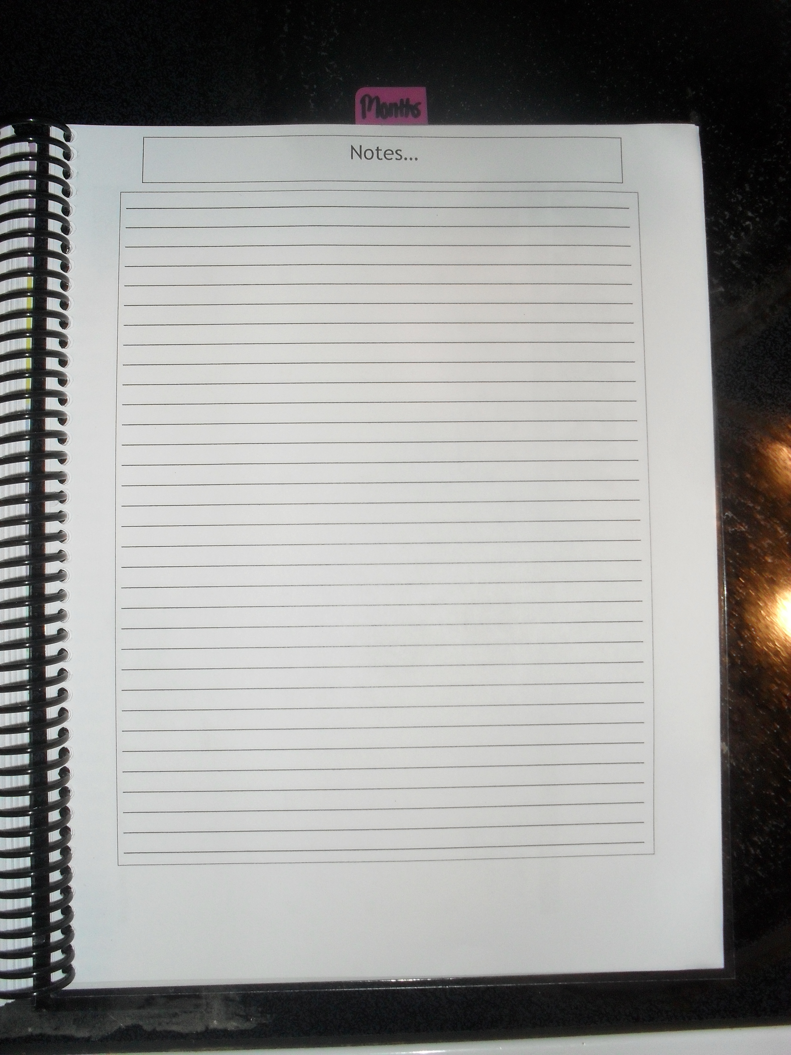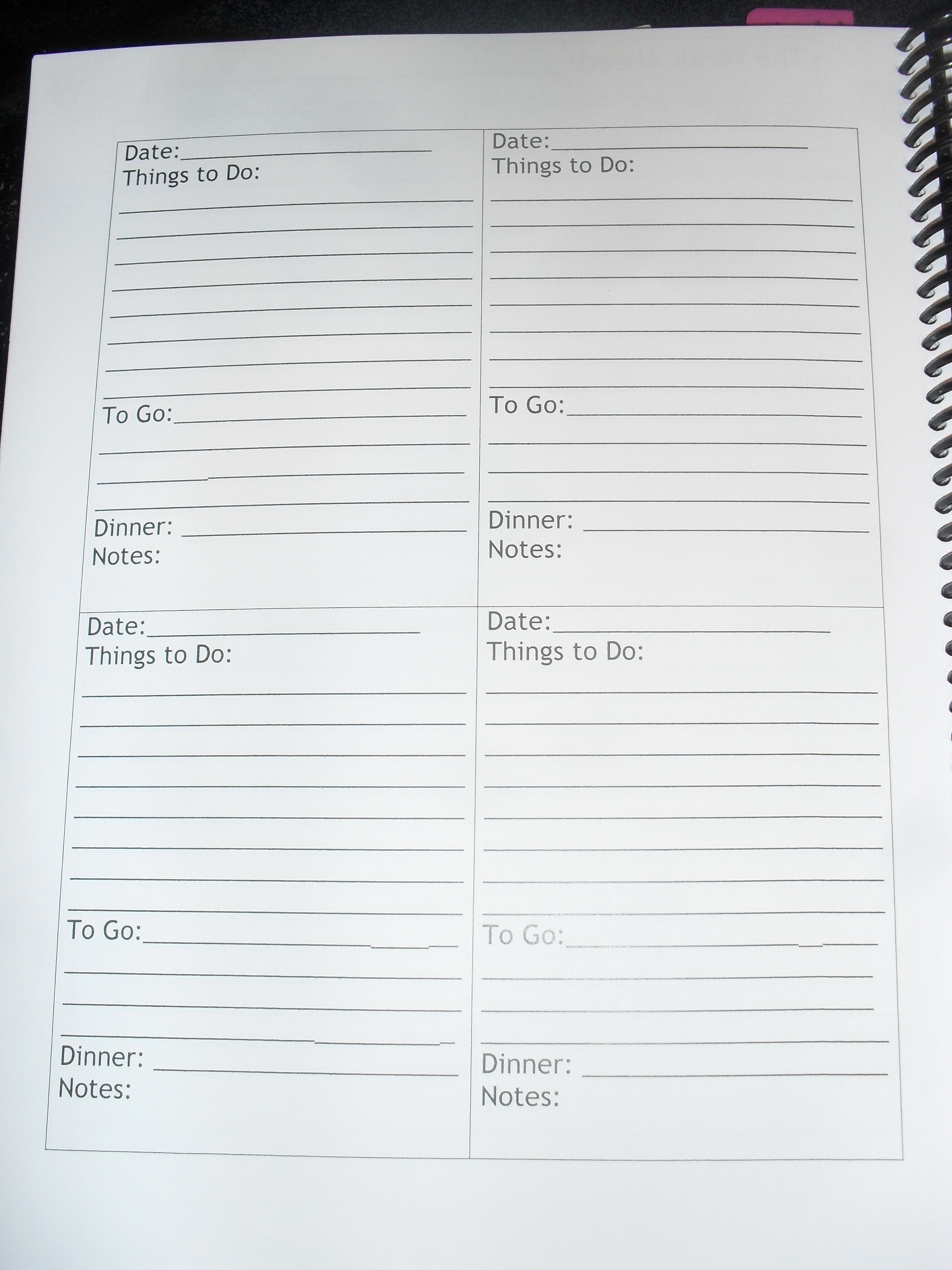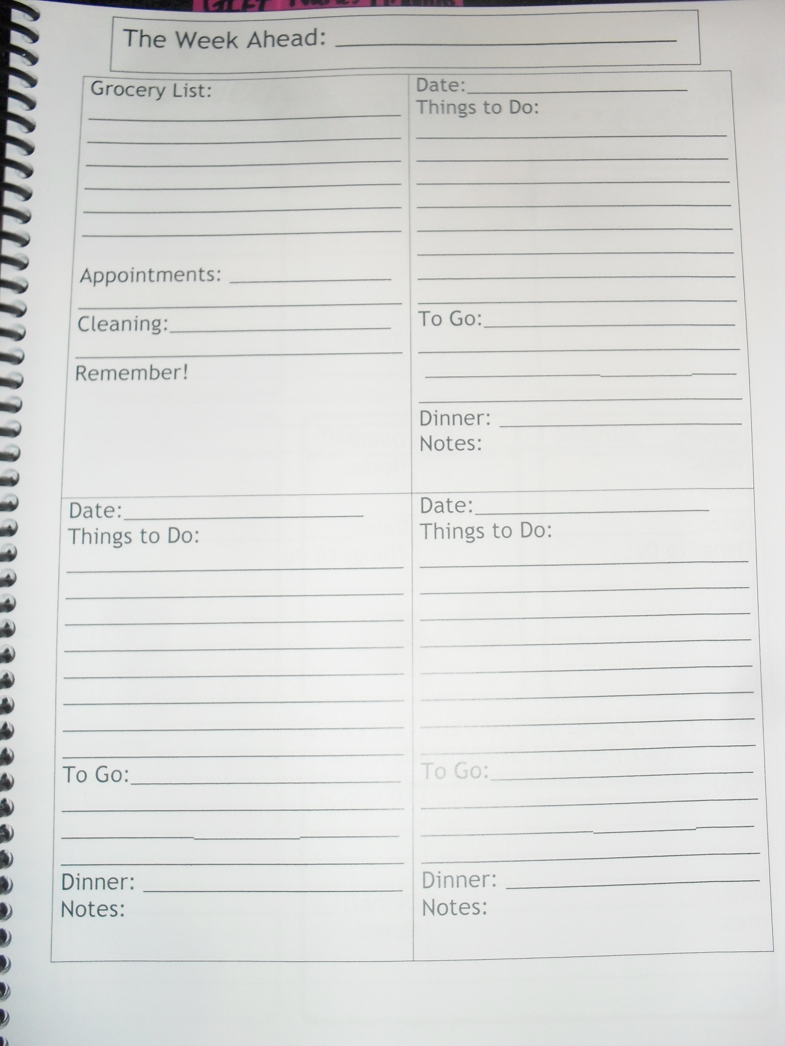 My way of keeping track of things to do, is making lists. I have piles and piles of lists. I had so many I would forget where I put them. I have been looking at planners, but could not find “the one” for me. My boyfriends sister had a planner that resembled my vision and I asked where she got it. She told me that she made it. Made it?! It looked like a cute, professional planner you would find at the store. I asked her how and she told me. It seemed easier than I expected. She sent me the sheets she made on Microsoft Word and I tweaked them to my own liking and printed them out.