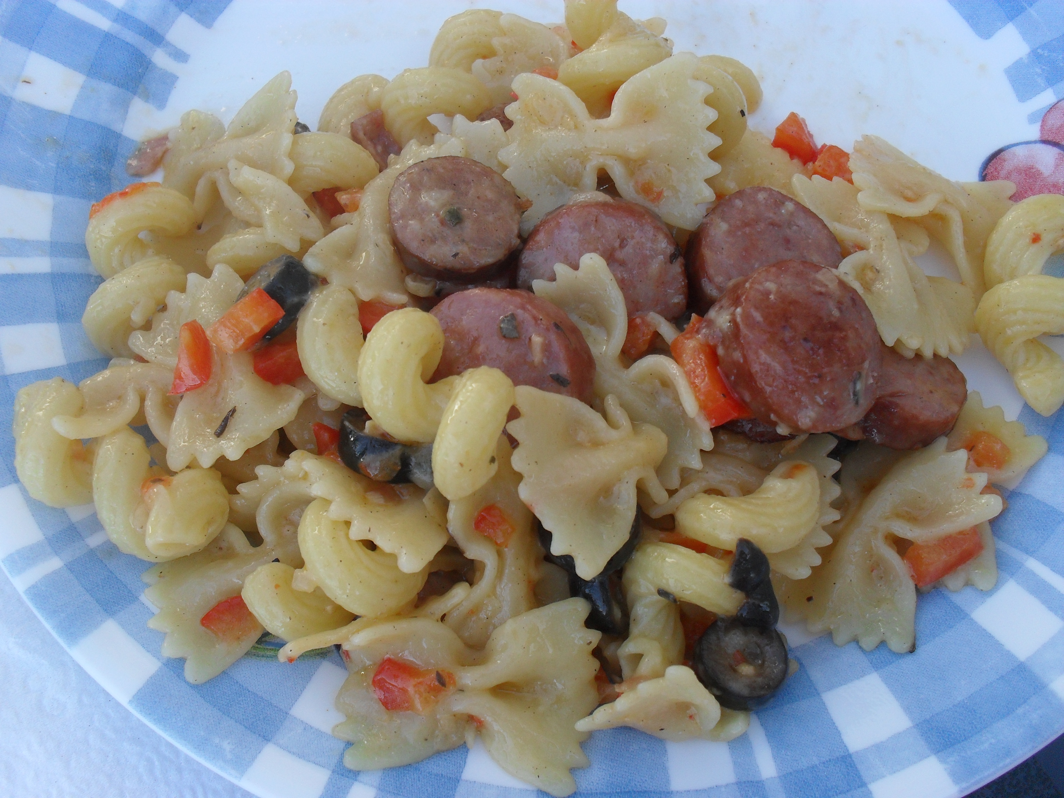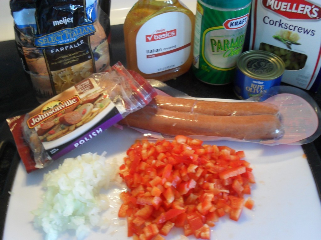 Ingredients: Italian dressing, pasta, sausage, black olive, 1 red pepper, 1 large onion, grated parmesan cheese