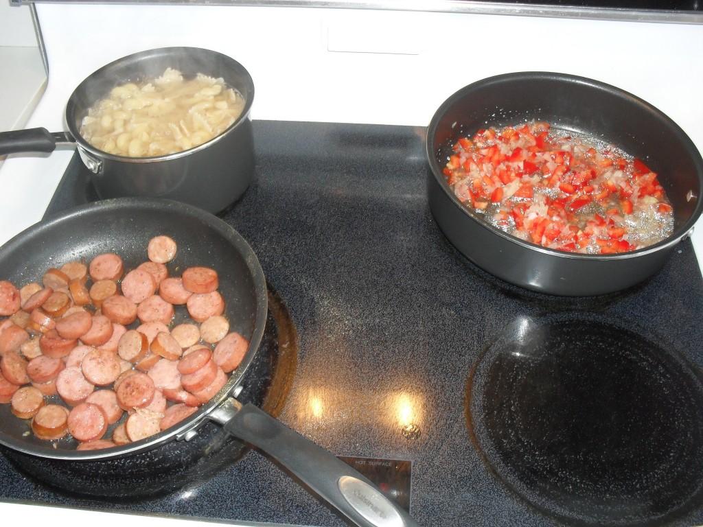 This Italian sausage recipe gives a different kick to the traditional pasta recipes. It can be used as a side dish or full meal. The possibilities are endless, this is a recipe you can make your own. I added black olive to this along with red pepper and onion. Other options could be mushrooms, green pepper, green olive…anything you want!